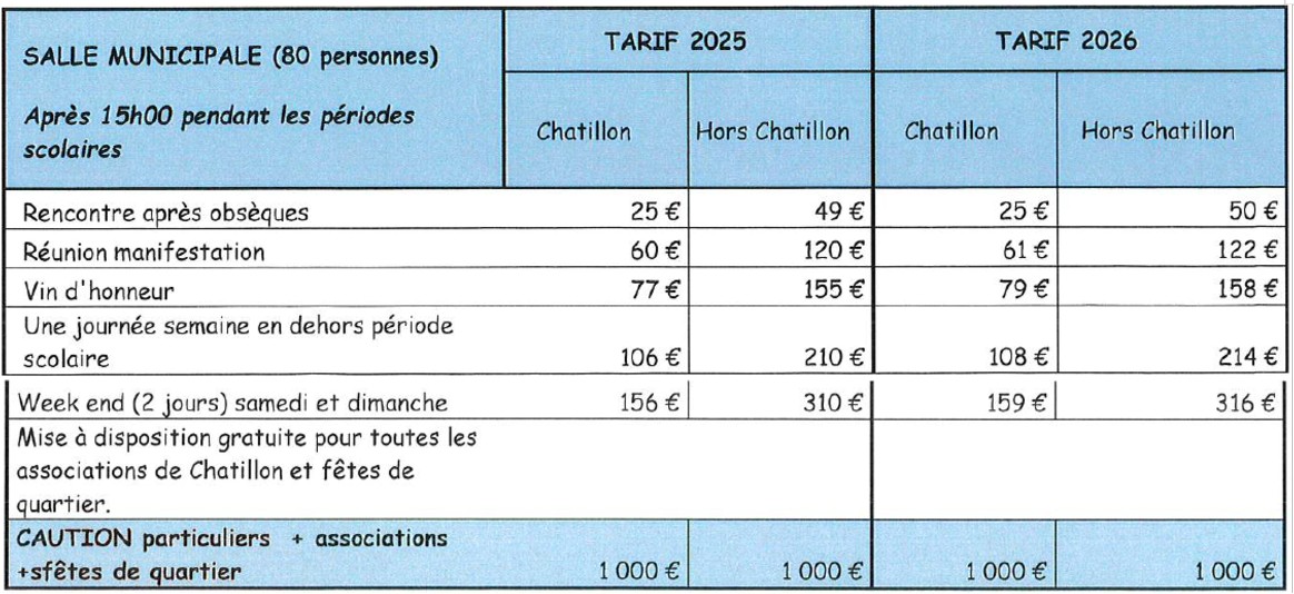 La capacité est de 80 personnes. Mise à disposition d’une kitchenette (pas de vaisselle). Les horaires d’occupation devront s’inscrire dans la législation en vigueur à savoir jusqu’à 1h du matin.